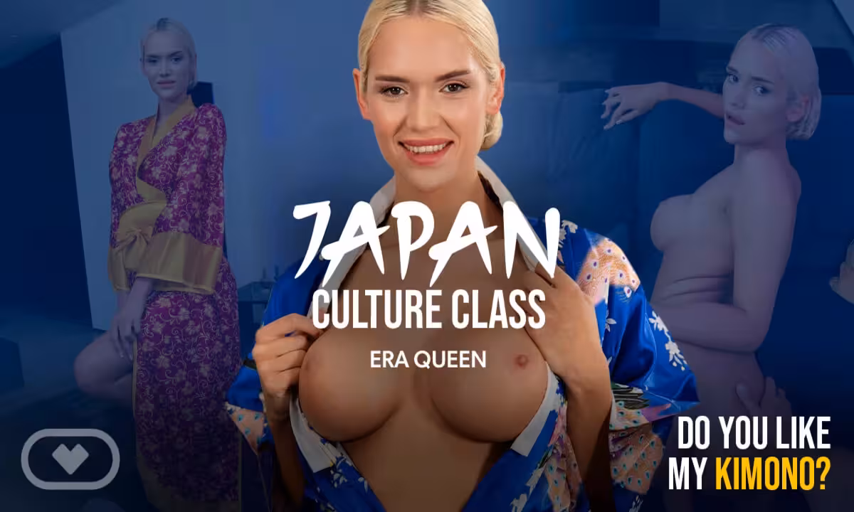 Era Queen models colorful kimonos, seducing with sensual sways. She kneels to tease, leading to passionate sex in cowgirl, reverse, doggy, and missionary, ending with cum over her body.