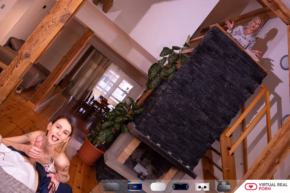 You go to your boss’s house for dinner and are waiting in the kitchen for her to come downstairs when her hot, petite, horny stepdaughter comes into the room, pulls your cock out, and gives you head while her stepmom is right on the other side of the counter. Once her stepmom leaves, she drops her panties, hikes up her skirt, and sits on the edge of the counter so you can bury your cock deep inside her, fucking that tight, teen pussy. You nearly get caught so you move to a couch where she rides you and you nearly get caught again. This time, she is too into it to stop and her stepmom, your boss, catches you as you cum in her stepdaughter’s mouth.