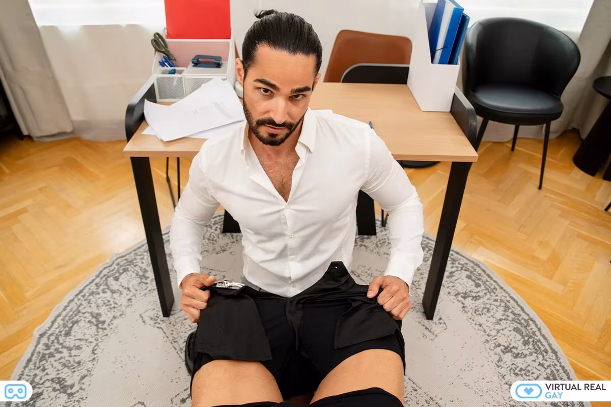 During an intense session of office VR porn, Alexandro Cabrera Puro Castro takes center stage in a provocative office setting. Puro Castro begins by kneeling to eagerly receive a blowjob, setting a passionate tone. The scene quickly escalates as he rides his partner in a reverse cowboy position, showcasing a dynamic and intimate connection. Their encounter continues with a variety of positions, each more thrilling than the last, highlighting their strong chemistry. At one point, his partner fingers Puro Castro’s mouth, adding an extra layer of sensuality to their exchange. The scene culminates in a powerful climax, where the partner jerks off while bringing themselves to orgasm, closing the encounter with raw, unfiltered desire. This vivid portrayal captures the intensity and variety of pleasure shared between the two, framed perfectly within the office environment.