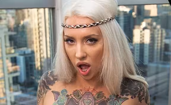 He me Rachel at a music festival and invited her to meet up with him the following week when she visited the city. The blonde, tatted up hottie gave him a call and stopped by his place. She knew what she was there for so she didn't waste much time getting naked and laying his fat cock between her big tits. A blowjob and some titty fucking later and she was backing herself up onto his hard shaft so she could bounce and ride. As she slammed herself down on his dick, she looked out the window at the gorgeous view of the city so she could see the people while cumming hard.