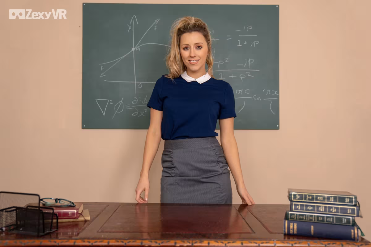 After class, your teacher Ms. Louise keeps you after to help you with your homework. You do such a good job, she rewards you by pulling her skirt up and showing you her red, lace panties. When you continue to do well, she wiggles out of the dress and dances for you in her underwear and thigh high stockings. As your study session continues, her clothes continue to come off until this sexy blonde is fully nude, her big, perky tits, and round ass looking fantastic as she dances and shows her naked body off.