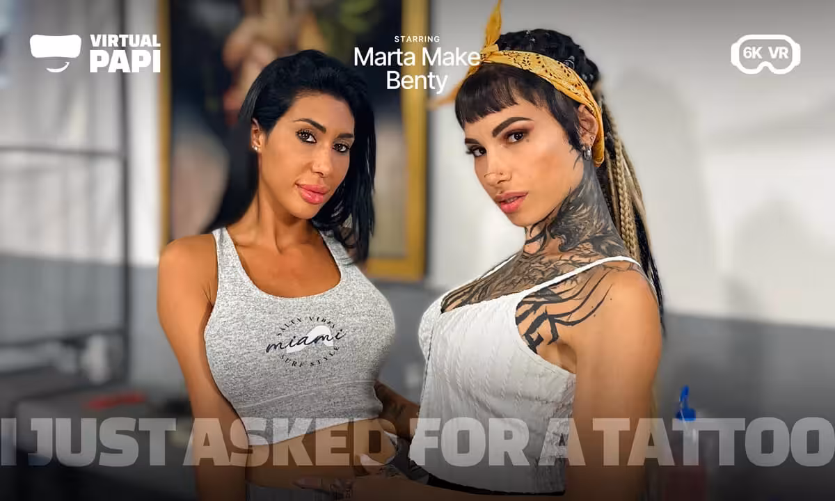 Tattoo VR porn kicks off with Benty eagerly delivering a blow job to Virtual Papi, her lips wrapped tightly around his cock as Marta Make watches nearby. The VR point of view captures every slick, deep bob of her head, her tongue swirling expertly along the sensitive underside. Marta soon moves in, sliding down to join Benty as their hands roam across each other’s bodies, fueling the erotic energy. Virtual Papi shifts onto his back, pulling Marta up to straddle him in a slow, controlled cowgirl position. Their bodies press flush, Marta’s breasts brushing against his chest as she sets the pace. Benty circles behind Marta and eases down into doggy-style, her fingers teasing Marta’s clit while her mouth explores Marta’s neck and shoulders. As the intensity climbs, Virtual Papi grips Marta’s hips firmly, guiding her movements while Benty alternates between licking and sucking at Marta’s folds. The scene builds steadily until Virtual Papi finally unloads, with Marta catching his cum in her mouth, all perfectly framed by the immersive VR point of view.