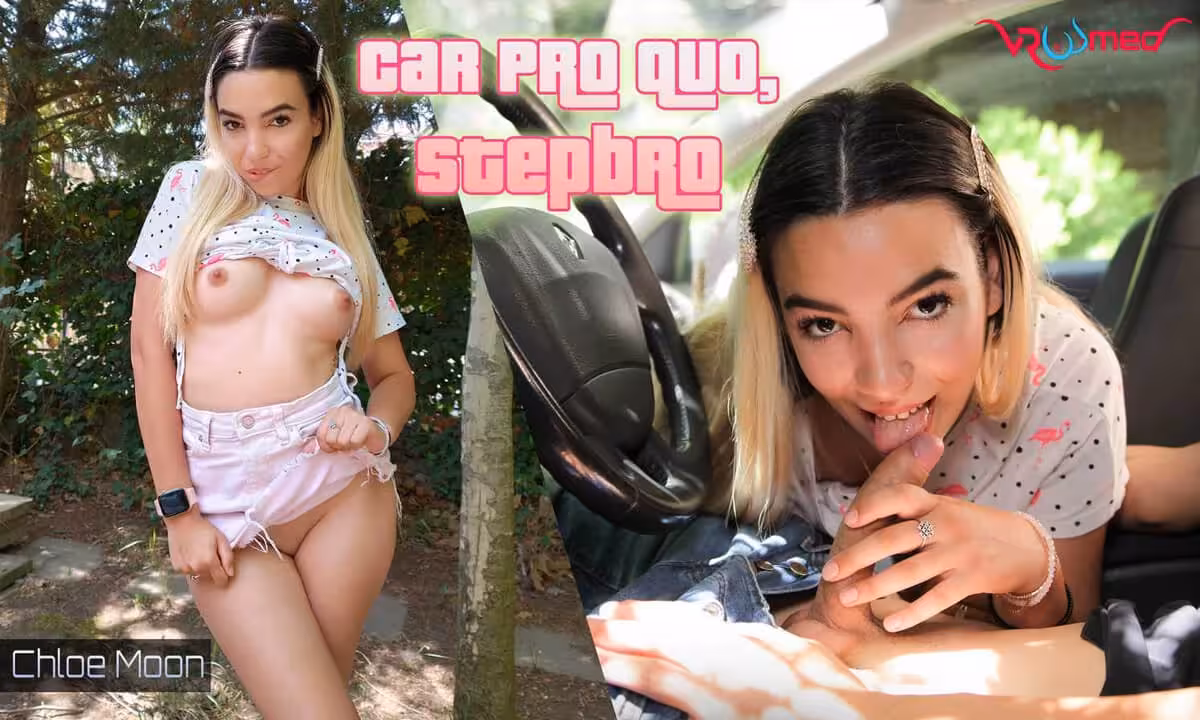 Chloe Moon takes control immediately in this blonde VR porn encounter, locking eyes and dropping to her knees with purpose. She wraps her lips around her partner’s length, using deliberate, steady motions as her hands find their way to the base, squeezing firmly to intensify the sensation. The VR point of view captures every detail, from the lush highlights of her long hair brushing shoulders to the subtle shifts in pressure as she deepens the blowjob. Her mouth works rhythmically, swirling and teasing, while her fingers maintain a relentless grip. Transitioning smoothly, Chloe rises and guides her partner toward the sleek bikes cars nearby, using the vehicle as support. She positions herself astride, sitting low and leaning forward with arms braced for balance. Her body moves with purpose; she lowers herself slowly, adjusting her angle to maximize contact. The pace quickens as her partner responds, hands gripping her waist, pulling her down harder. The intensity grows as Chloe rocks back and forth, driving the scene toward a climactic finish that completes with a satisfying cum-in-mouth moment, all experienced from the