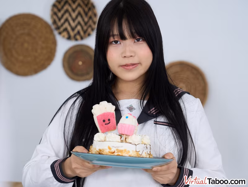 Riri VR adores cooking pastry. She has found a bit of success through social media with a weekly online broadcast of her favorite sweets. It started small, but now she has a fairly sizable audience talking about chocolate and whipped cream. She often shares intimate details from her life and decides to tell her followers a secret. Over the past few months she has developed a huge crush on a handsome older man. She wants to share her feelings, but the man is her mom´s new husband and he never looks at her seriously. She desperately wants to catch his attention, and decides to treat him with a special taste of Japanese sweets. When stepfather sees her, so young and sexy, with a cake in her hands, he can’t resist the temptation. He knows it is wrong and wants to refuse her advances, but she tells him it is totally fine if she can show him something more than just a cake. Pretty Riri turns her attention to his cock. Her blowjob makes him hard and he can’t wait to slip inside of her pussy. Riri is wet and ready as the man she wants starts fucking her. It is as good as she hoped and she can tell he likes it too. She starts a footjob that makes him moan , back on his cock, she speeds up, grinding her hips on his huge prick and not letting up. She can feel him start to pull out, but just fucks him harder, feeling him explode in any minute, until he pulls out and pour his jeez all over her pretty face.Riri knows she can have his cream whenever she wants.