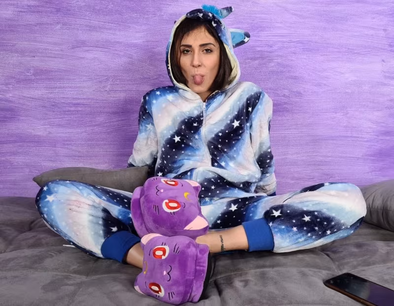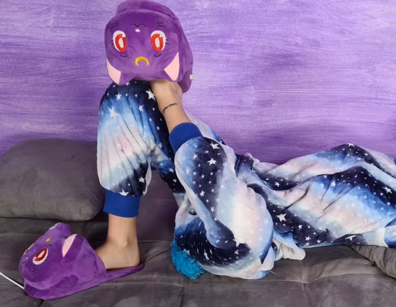 Stunning Aradia In A OnePiece Hooded Pajama And Purple Slippers