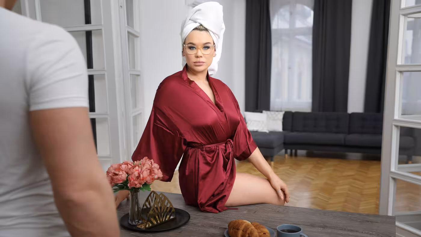 Gina Varney VR has been married for a while and has been waiting for a special opportunity to be naughty. Ever since her stepson moved back into the house after college, she has been lusting after him in secret. With her husband away on a business trip, she finally has a chance to act on her desires. While you eat your breakfast, Gina joins you wearing a robe. After she makes you close your eyes, she reveals the sexy lingerie she is wearing underneath. You can’t believe your eyes. Your busty blonde stepmom is sitting on the table looking like a super-hot VR Pornstar just waiting to do anything you want. Her ass is so plump and juicy that you grab it with both hands the second she tells you how much she wants you. She strips out of her bra and panties to give you access to her firm tits and tight, waiting hole. Your young, hard cock and powerful strokes are everything she has been fantasizing about and more. Banging your sexy blonde stepmom over the family breakfast table is a dream come true for you as well, but you need more room to fully enjoy one another. Gina gets to work licking her juices from your cock and keeping it nice and wet so she can ride you. Her big ass fits nicely in your hands and your big cock is exactly what Gina has been missing since marrying your father. When you can hold your load no longer, she gets on her knees and begs you to feed her every drop. With all that cream on her lips she promises to let you fuck her any time as long as you don't tell your father what a cheating slut she is.