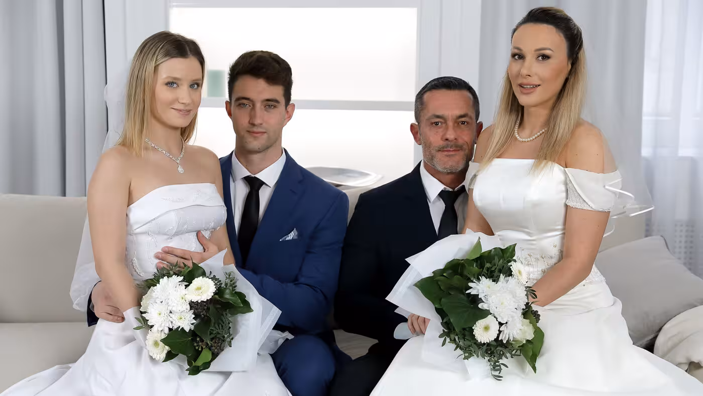 Today is a very special day for Karina King VR and her daughter Lily. The beautiful mother and daughter team are both getting married on the same day. To make things even more interesting, they are marrying a father and son team, making Karina a bride, a stepmom and a mother in law all at once. Both Lily Blossom VR and Karina are sexually adventurous and have something special in mind for their wedding day. During the photos, they start to lift their dresses, flashing their bare pussies and asses to the camera. The grooms-to-be play along, letting the poses get a little risqué, but realizing that they are not just playing. As the two blonde brides take the grooms' cocks from the pants, all the men can do is stand still and enjoy the ride. Things are mildly kinky but fine until the girls decide that it is time to switch partners. Karina's stepson can't believe that his dad's new bride is sucking his cock. Just inches away, the young man's pretty bride is slurping on her father in law's fat pole. Mixing it up, they slip out of their dresses and take turns fucking both men. It is a taboo wedding orgy beyond their wildest dreams, but that doesn't slow down either of these horny studs. Both women are happy with the men they are marrying, but knowing that good dick is also available so close in the family means that they are going to enjoy long and very happy marriages. They are so busy thinking about that, that they do not notice when father and son both unload big wads of cream into their bare pussies. This may be the beginning of a very different taboo family affair.